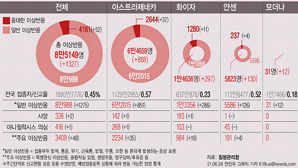 1차 접종에 두통, 발열 같은 증상이 많은 반면 모더나나 화이자의 경우는 1차와 2차 백신 접종 후 근육통, 오한, 발열, 관절통 등의 증상이 거의 같은 비율로 나타납니다.