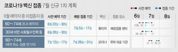 -60~74세 등 6월 예약자 중 초과 예약자 : 화이자 7월 5일~7월 17일 접종
