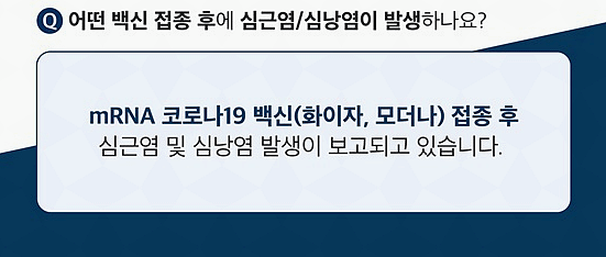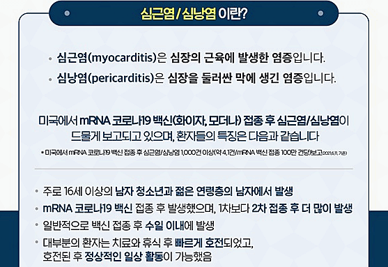 화이자와 비슷한 방식인 모더나의 부작용으로 확인된 것은 100만 명 중 4명꼴로 발생한 심근염과 심낭염이라 합니다. 둘 다 가슴 통증이 있는 건 똑같지만, 심근염은 심장이 빠르게 뛰면서 두근거립니다.