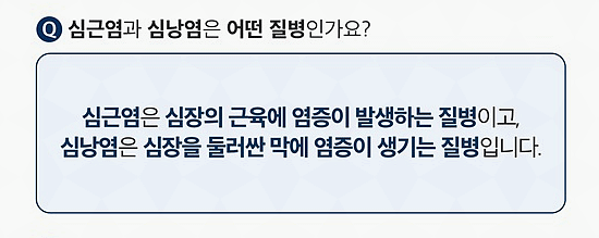 숨이 가빠지는 증상이 있으며 심낭염은 숨을 들이마시거나 몸을 뒤로 젖힐 때 통증이 심해지는 등 호흡과 자세에 따라 통증이 있다 없다 하는 게 특징입니다.