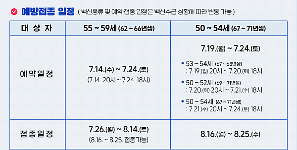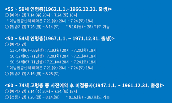 그리고 예약을 놓친 분들을 위해 50대에 해당하는 모든 분들은 7월 21일 수요일 오후 8시부터 사전 예약이 가능합니다. 하지만 사전예약은 7월 24일 금요일 오후 6시까지 종료된다는 점을 꼭꼭 기억하셔야겠습니다.