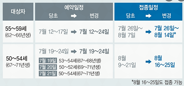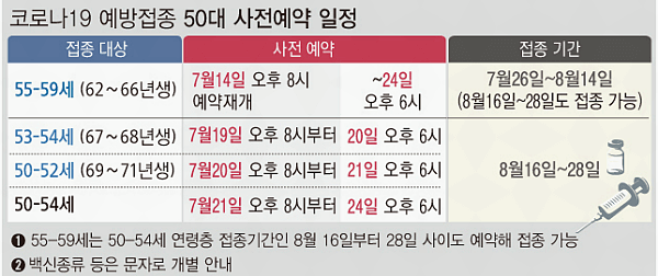 참고하실 사항은 55-59세에 해당하는 분들은 50-54세 연령층 접종기간인 8월 16일부터 25일 사이에 예약하여 접종이 가능하다는 점입니다. 아마 사이트가 마비되어서 피해를 본 분들에 대한 당국의 배려가 아닐까 싶습니다.