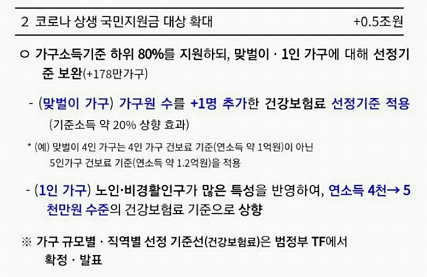 1인 가구 5,000만 원 이상은 지급 외대 상인점 참고하시면 됩니다. 그리고 차상위계층, 한부모가정, 기초생활수급자 등 저소득층은 296만 명은 1인당 현금 10만 원을 추가지 원한 다고 합니다.