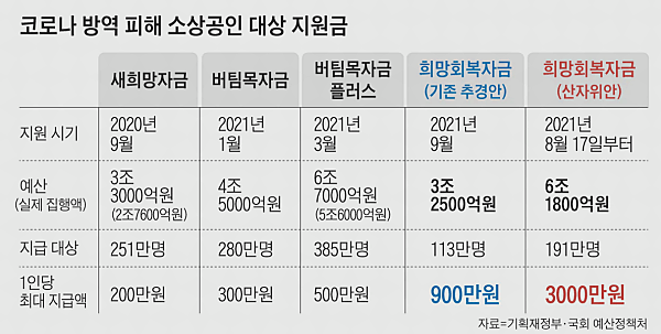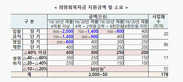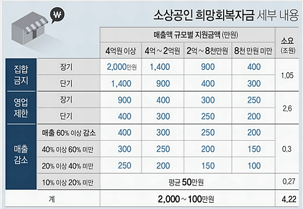 코로나19로 집합 금지나 영업 제한 조치를 받은 업장들은 매출 규모 등에 따라 최소 50만 원에서 최대 2000만 원의 희망회복 자금을 받을 수 있습니다. 지급은 다음 달 17일부터 차례로 이뤄질 예정입니다.
