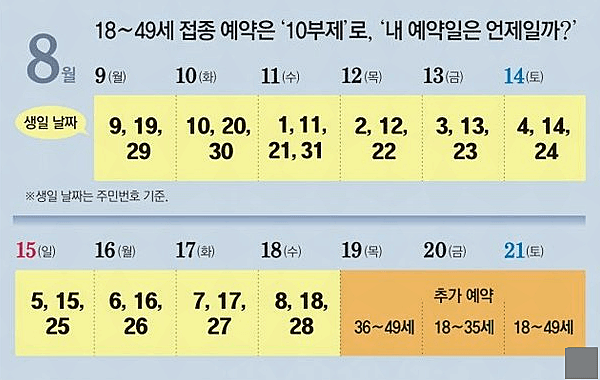 따라서 40대 백신 미접종자 중에서 우선접종 대상자는 이번 주에 예약을 하시고 우선접종 대상자가 아닌 일반 대상 접종자인 경우 다음 주 9일(월요일)부터 10부제에 따라 18~49세 연령층과 같이 사전예약을 하시면 됩니다.