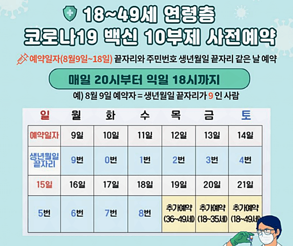 8/9(월)~8/18(수) 해당 기간 동안 주말을 포함한 모든 날짜에 해당 날짜 끝자리와 생년월일 끝자리가 일치하는 사람이 해당 날짜의 예약 가능 대상입니다.