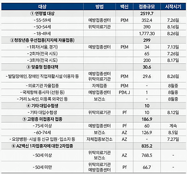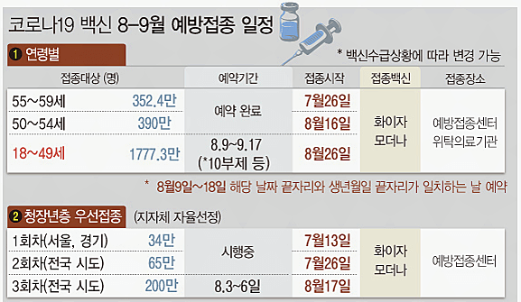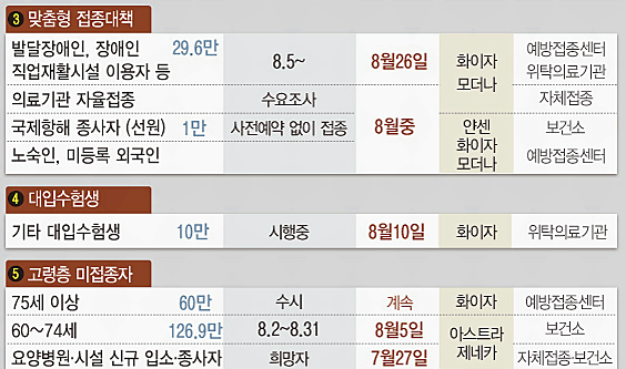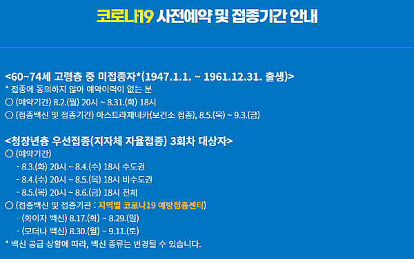 접종은 위 표와 같이 8월 17일부터 시작되어 9월 11일까지 실시할 것으로 발표하였습니다. 접종 백신은 화이자와 모더나로 접종이 진행됩니다.