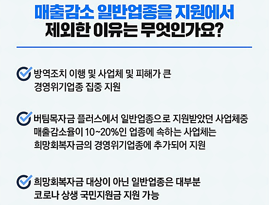 발표한 내용을 보면 버팀목 자금 플러스에서 일반업종으로 지원받았던 분들 중 매출 감소율이 10~20%인 업종에 속하는 사업체는 경영위기업종에 추가되어 지원받는다 라고 나와있습니다.