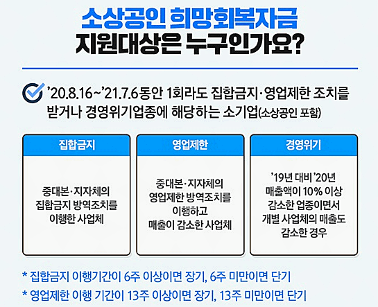 소상공인 희망회복자금 지원 대상은 지난해 8월 16일부터 올해 7월 6일 사이에 집합 금지나 영업제한 조치를 이행했거나 경영위기업종에 해당하는 소기업소상공인입니다.