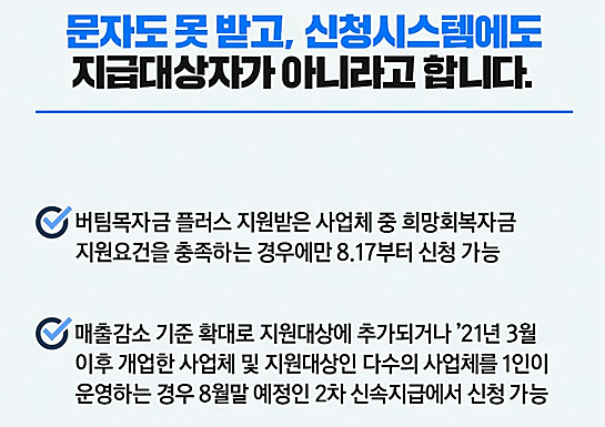8월 30일(예정) 이때는 기존 버팀목 자금 플러스 지원대상이 아니었지만 이번 매출 감소 기준 확대로 대상에 추가되거나 2021년 3월 이후에 창업한 사업체, 여러 개 사업체를 1인이 운영하는 경우입니다.