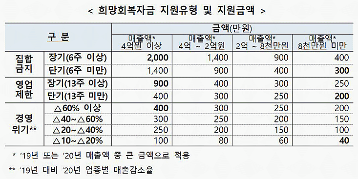 지원금은 최대 2,000만 원 최소 300만 원으로 여기서 헷갈리는 내용이 매출인데 이는 19년도 또는 20년도 중 선택할 수 있습니다. 예를 들어 19년도 3억 원, 20년도 1억 원이면서 6주 이상 집합 금지라면 1,400만 원을 받게 됩니다. 대표적으로 유흥시설, 실내체육시설, 대형 학원, 독서실, pc방 등이 해당됩니다.