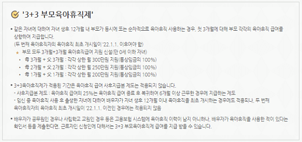 이외에도 '아빠 육아휴직 보너스제'인 육아휴직 급여 특례는 같은 자녀에 대해 부모가 순차적으로 모두 육아휴직을 사용하는 경우인데 두 번째 사용한 사람은 육아휴직 3개월 급여를 통상임금의 100%(상한 250만 원)로 상향하여 지급받게 됩니다.