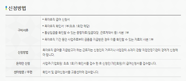 근로자가 직접 작성한 육아휴직급여 신청서와 사업주가 직접 작성한 육아휴직 확인서를 거주지 또는 사업장 소재지 관할 고용센터에 제출하면 되고 근로자는 육아휴직 개시 후 1월이 경과한 시점부터는 매월 단위로 신청해야 합니다.