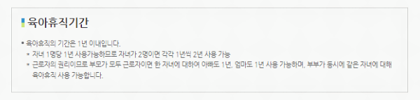 기업도 이러한 제도를 통해 기업의 숙련도 있는 인력을 확보할 수 있는 장점이 있습니다. 2020년 2월 28일부터는 부부가 함께 동시에 육아휴직 신청이 가능하고 육아휴직기간은 1년 이내로 합니다. 자녀 1명당 1년 사용이 가능하고, 자녀가 2명이면 각각 1년씩 2년이 가능합니다.