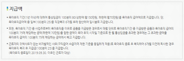 육아휴직 시작일부터 첫 3개월까지는 통상임금의 100분의 80(상한액:월 150만 원, 하한액:월70만 원)을 육아휴직 급여액으로 지급하고 있고, 육아휴직 4개월째부터는 육아휴직 종료일까지 통상임금의 100분의 50(상한액:월120만원, 하한액:월70만원)을 육아휴직 급여액으로 지급받을 수 있습니다.