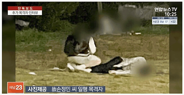 연합뉴스 TV는 12일 경찰이 추가 목격자를 확인해 진술을 청취했다며 이 목격자를 만나 그가 제공한 사진을 공개했습니다. 사진에는 한 남자가 누워있고 그 옆에는 야구점퍼를 입은 남자가 쪼그려 앉아 있습니다. 두 사람의 복장은 사건 당일 정민 씨와 A 씨의 복장과 일치하고 있습니다.