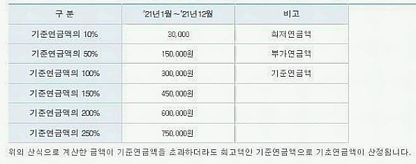 - 국민연금액에 따른 기초연금액 = 기준연금액의 250%-국민연금액 등
