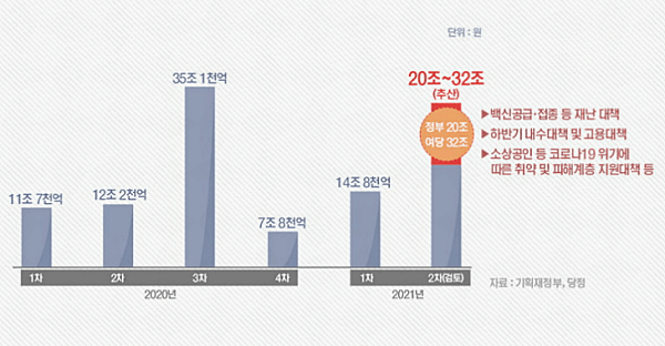 민주당은 더 걷힌 세금은 다시 국민에게 돌려주자는 입장입니다. 빚을 내 지원해도 시원찮을 판에 세금을 더 걷는 게 말이 되냐는 것입니다. 민주당은 추경안으로 30조 원+a를, 재난지원금은 전 국민 지급을 주장합니다.